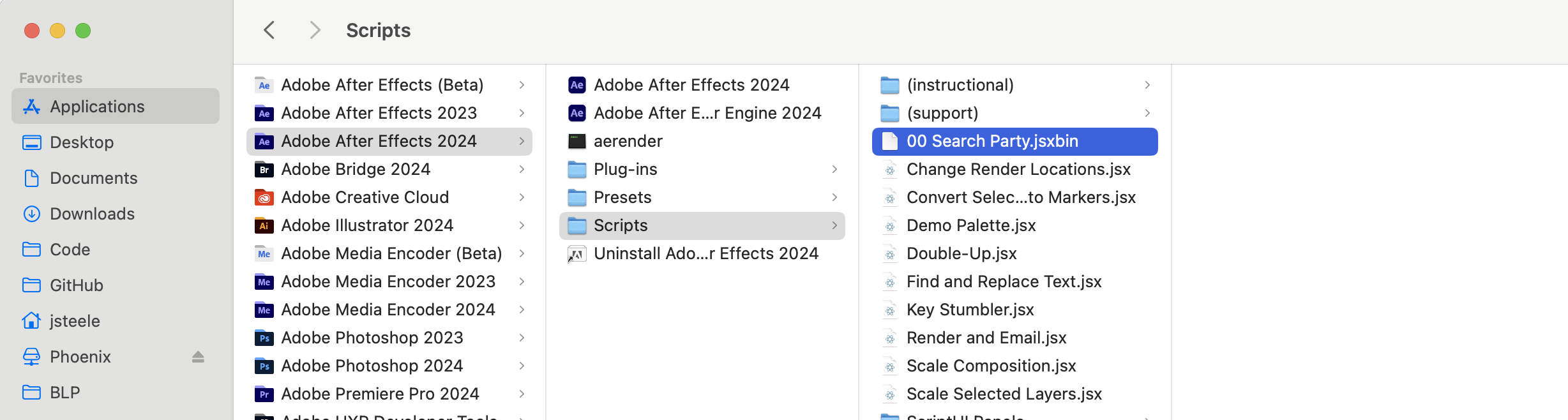 00 Search Party.jsxbinfile to After Effect’s Scripts Panels folder. You will find it in the following locations: